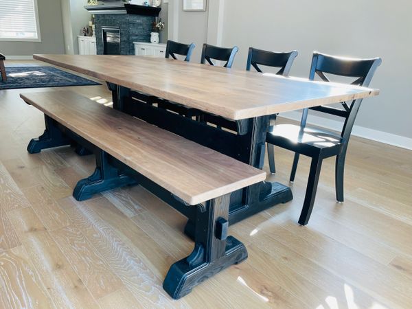 Table Top: I offer a vast selection of wood choices. Utilizing only the best hardwoods based on Janka density and fiberistic properties. For a finished product that will withstand the dry humidity of our Minnesota winters and the everyday use of your family's activities. (Please see "Wood Species Page" for more details.)