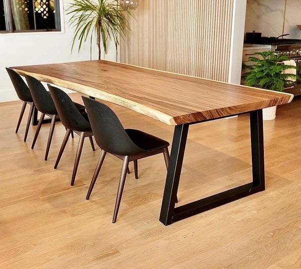 The Metal & Wood Trapezium Style. Similar to the Metal Cube Style however the Trapezium Style offers a ten-degree offset. The perfect balance for open-concept spaces. Maintaining an even weight from top to bottom. A design favorite among home staging professionals, but as I pride myself on being a designer for everyday life. Note it's not the most functional for chair positioning. (Pictured: Spanish Parota Live Edge in Pure at 36" Counter Height)