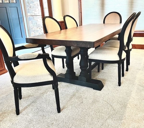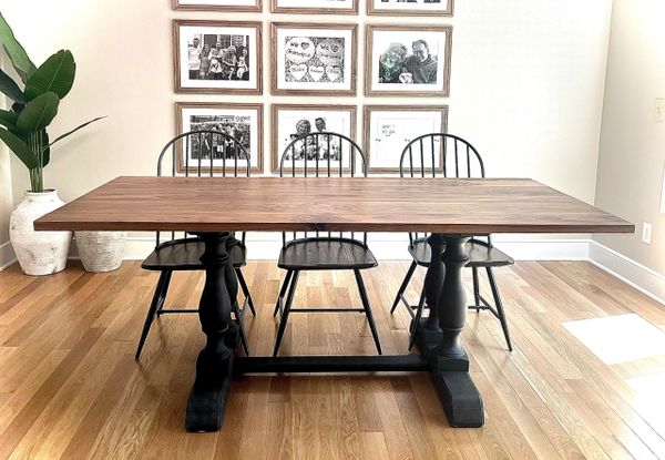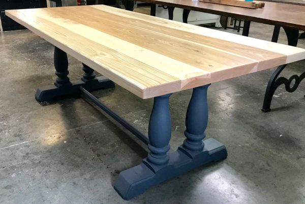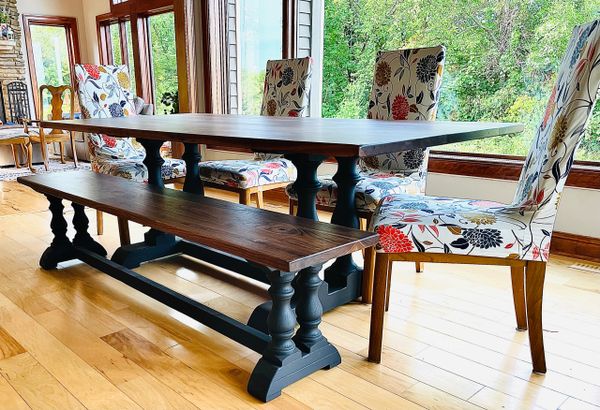 Vintage Farm Style: A dining table that celebrates the organic beauty of wood in a traditional design. The Vintage Farm Style is carefully crafted by hand from sustainable harvested Black Walnut that reveals natural variations lending each piece one-of-a-kind character. A solid seamless design and elegantly turned feet enhance its timeless charm. (Pictured: 2" Douglas Fir in Castle Brown - 88")